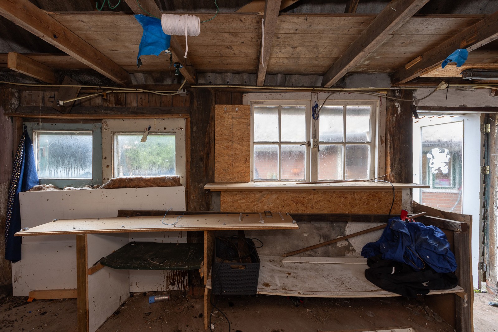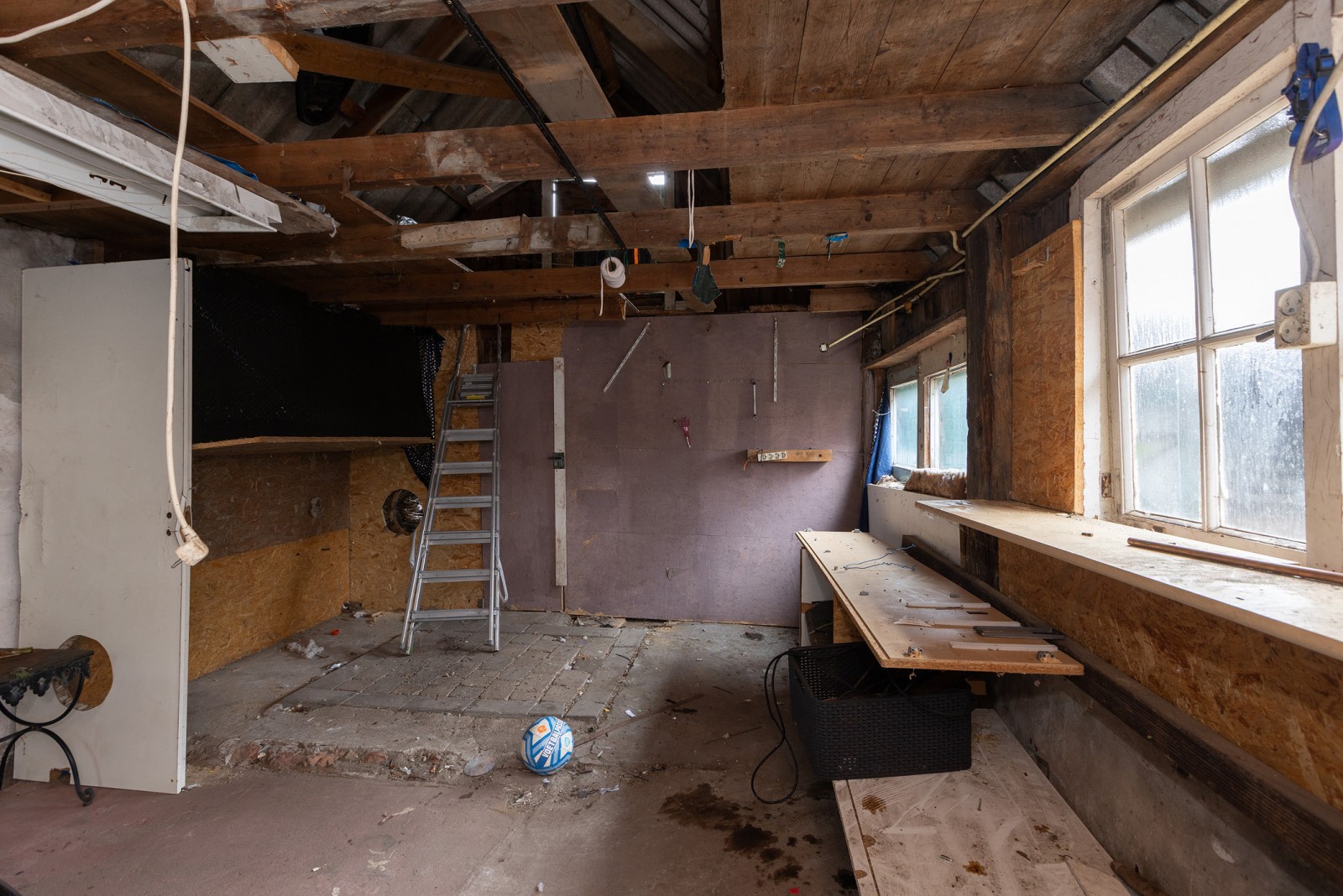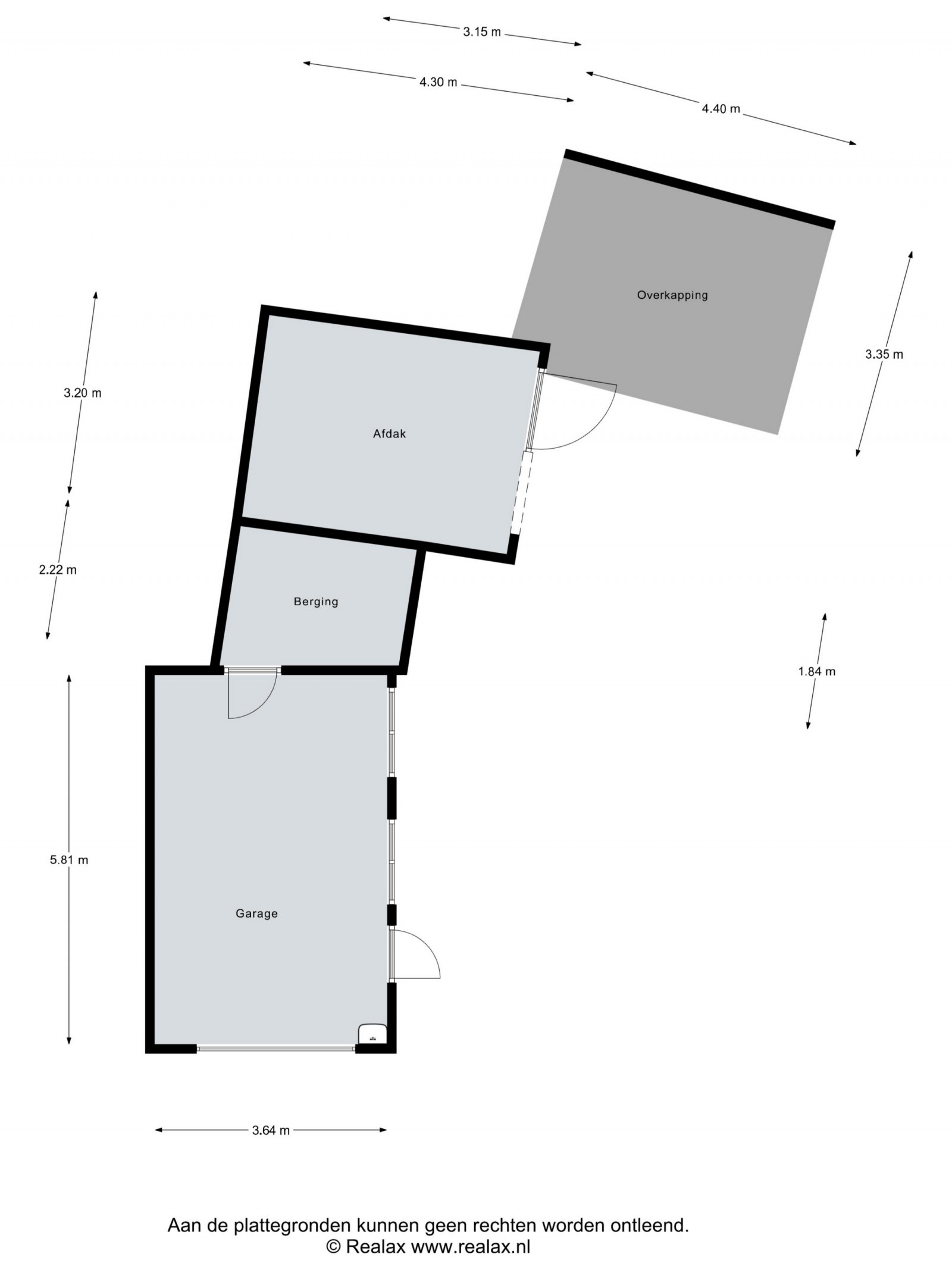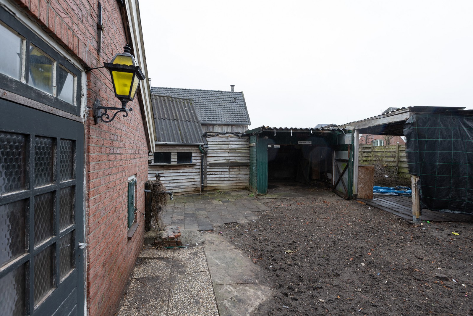 Op het perceel bevindt zich een vrijstaande houten garage met aangrenzende berging. Daarnaast is er een aangebouwd afdak en een separate overkapping aanwezig. De tuin rondom de woning dient opnieuw te worden aangelegd, wat de mogelijkheid biedt om het geheel naar eigen inzicht vorm te geven. De kenmerken zijn: