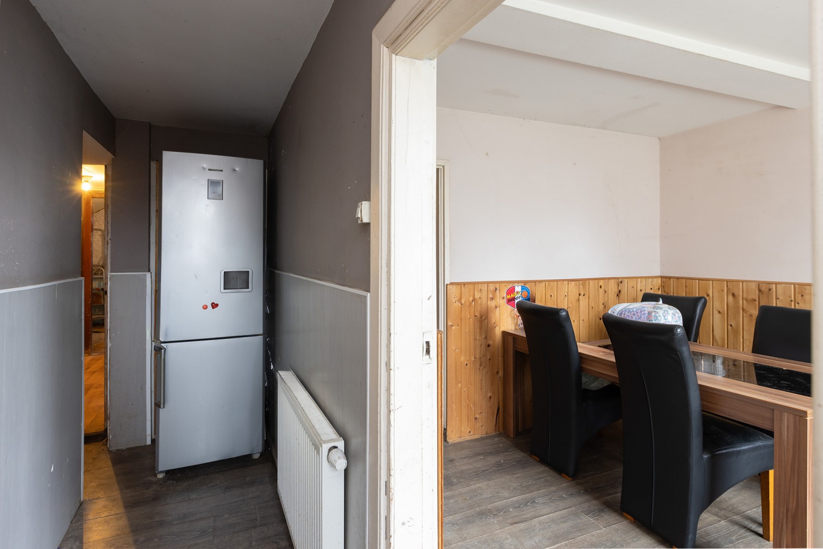 Entree/hal met vaste kast en toegang tot de woonkamer, welke is voorzien van vaste kasten en een aansluiting voor een kachel. De keuken is uitgerust met een eiken inbouwkeuken. Vanuit de keuken is er toegang tot een tussenhal met trapopgang en twee slaapkamers. Verder bevinden zich op de begane grond een toilet en een bijkeuken met CV-opstelling en aansluitingen voor de wasmachine en wasdroger. Een derde hal biedt toegang tot een slaapkamer en een aangrenzende badkamer, voorzien van een douche en ligbad.