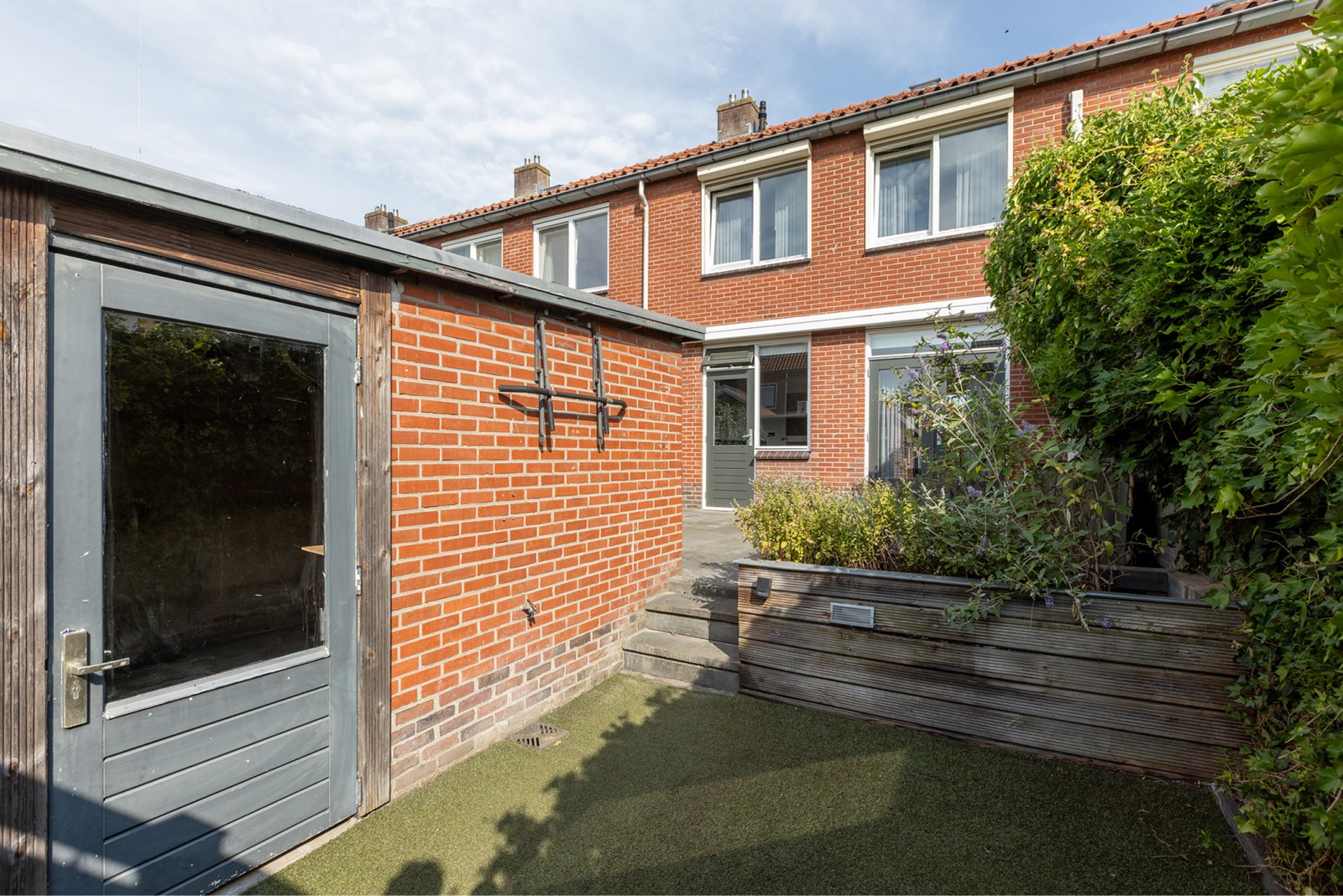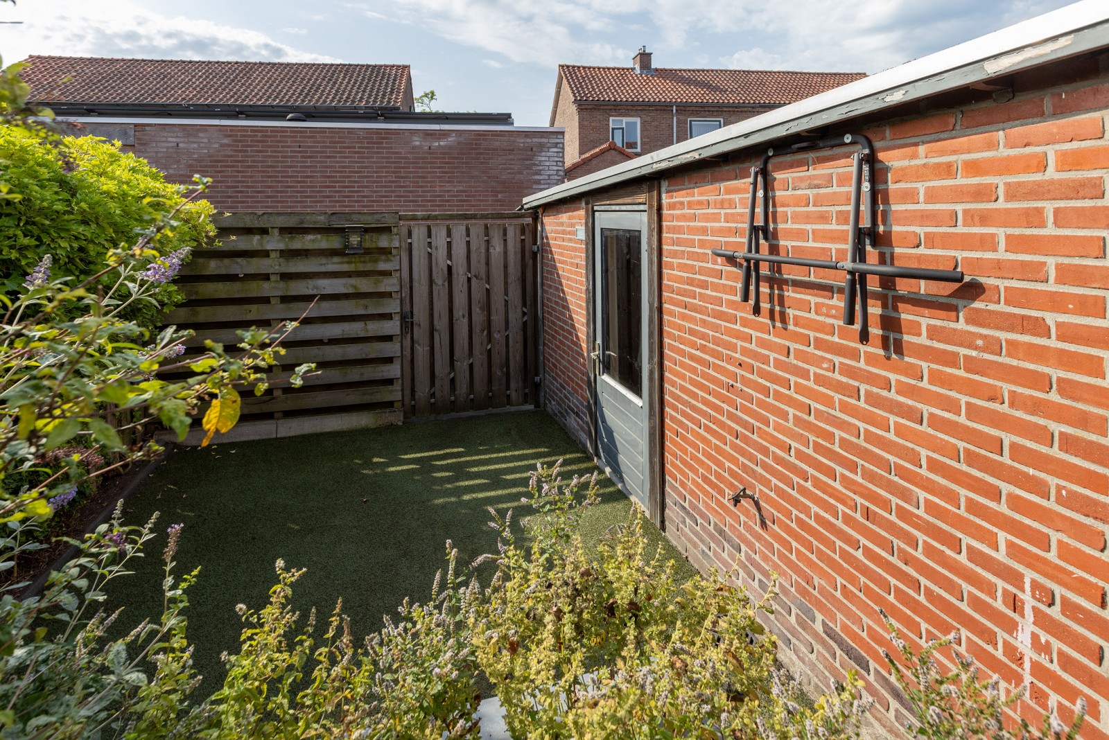 – Geheel omsloten tuin op het zuidoosten met een opgehoogd terras, gazon, border, stenen schuur en achterom.