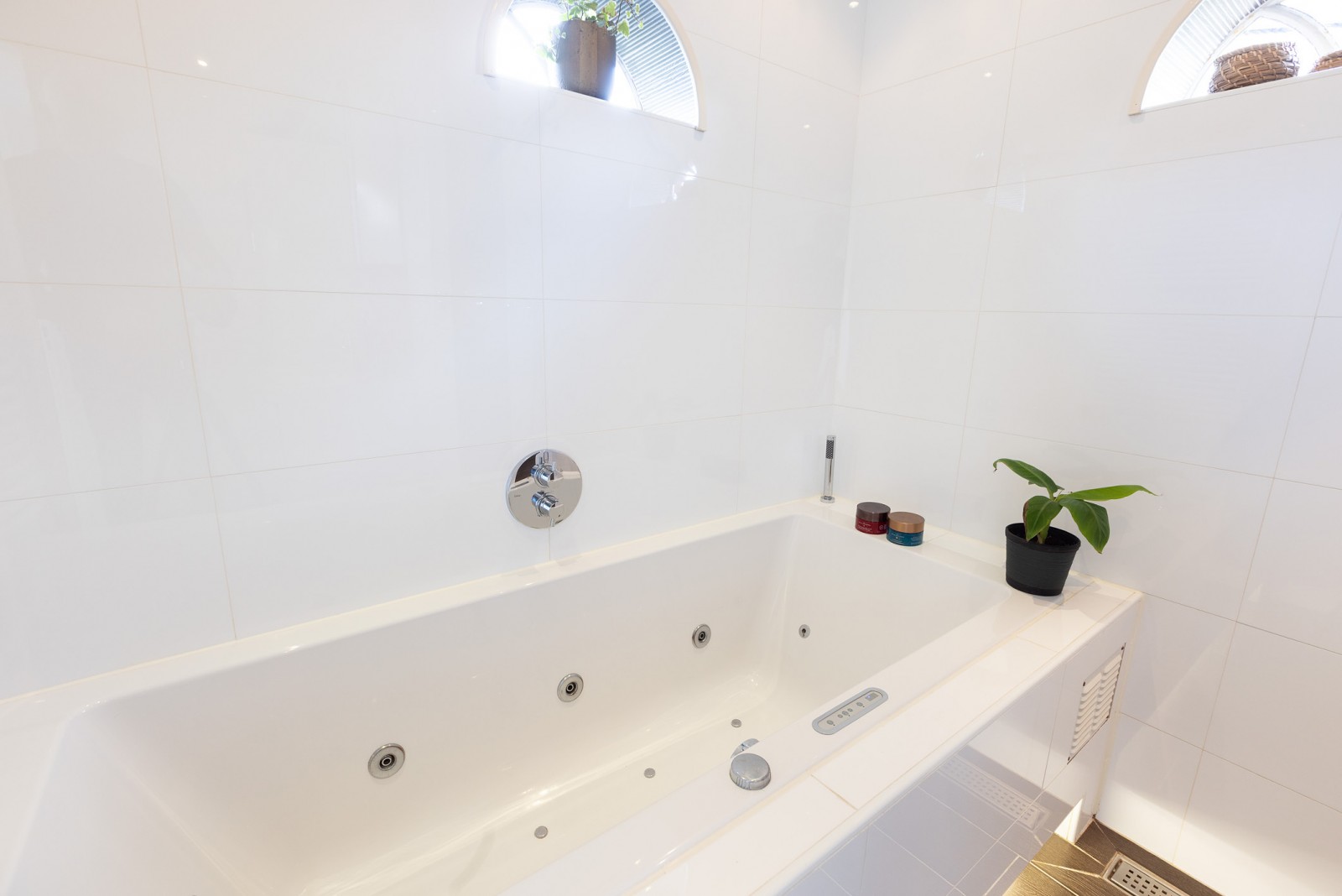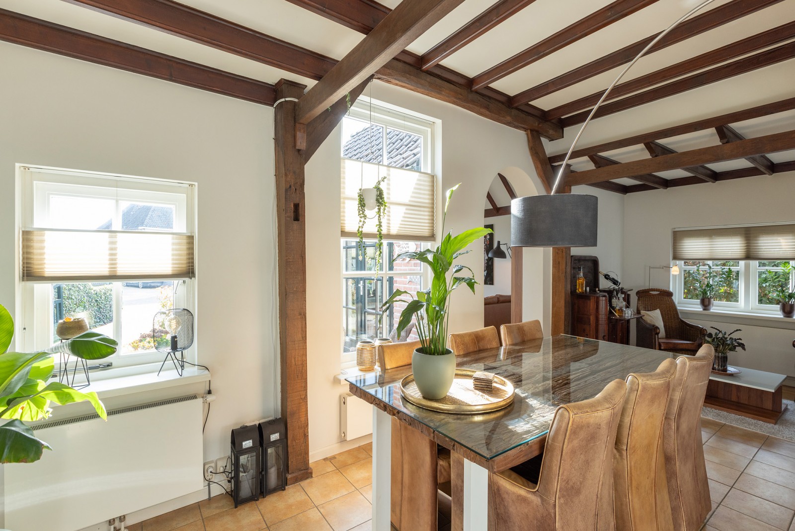 Hal met vide, toilet met wandcloset en fonteintje. Slaapkamer met aangrenzende, luxe badkamer. Deze is voorzien van een whirlpool, inloopdouche met hydro-jets/zijdouche en een wastafelmeubel met dubbele wastafel. Sfeervolle woonkamer met als stralend middelpunt een prachtige schouw met aansluiting voor een houtkachel. Vanuit deze ruimte bereik je de aan de voorzijde van het huis gelegen zitkamer met stijlvolle, hoge plafonds en openslaande tuindeuren die toegang verschaffen tot het terras. De open keuken grenst aan de woonkamer en is voorzien van een inbouwkeuken met een 4-pits gaskookplaat, afzuigkap, combi-oven (2024), koelkast (2021) en vaatwasser (2021). Aangrenzend vind je een praktische bijkeuken met aansluitingen voor de wasmachine en wasdroger en daarnaast een inbouw koelkast en vriezer.