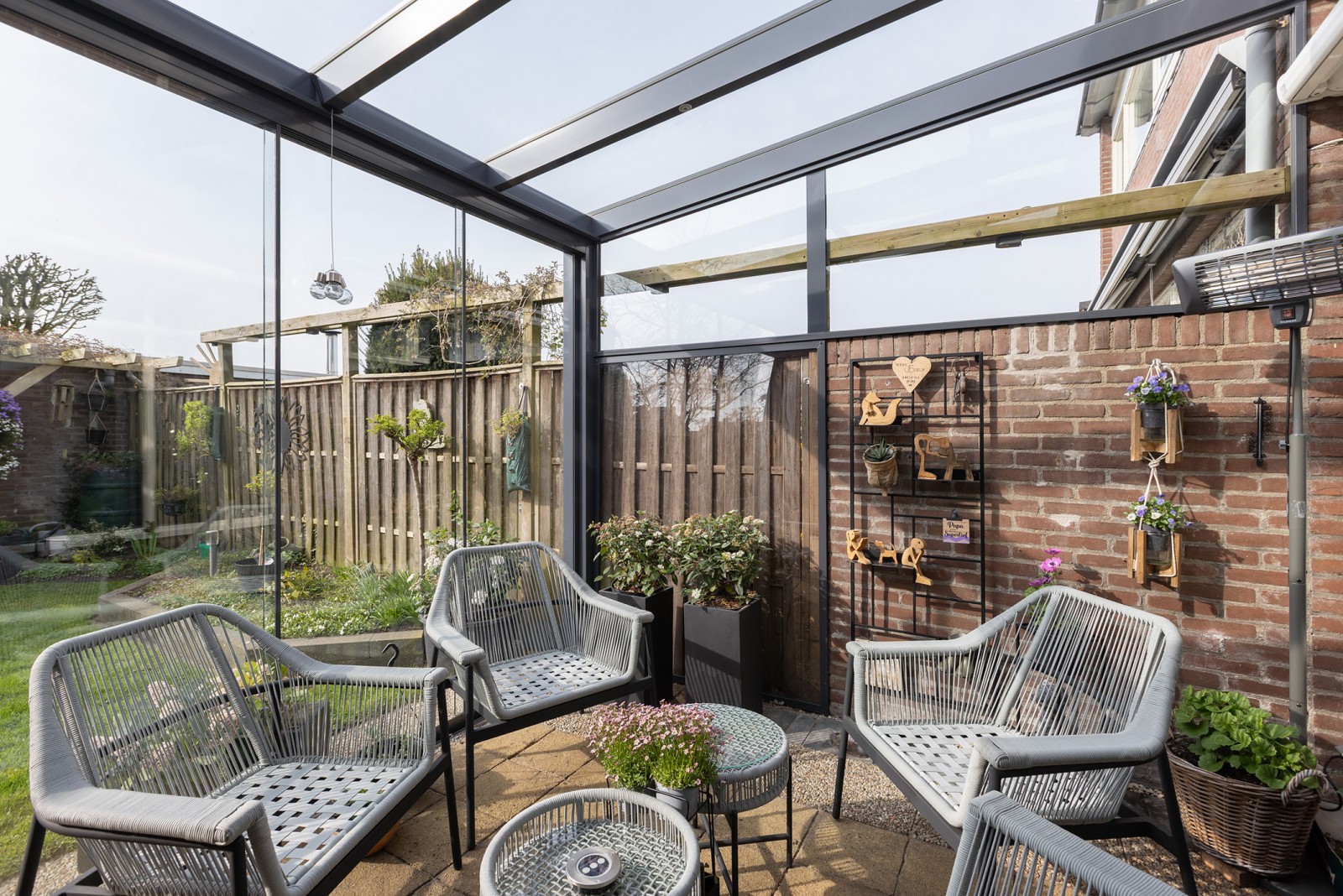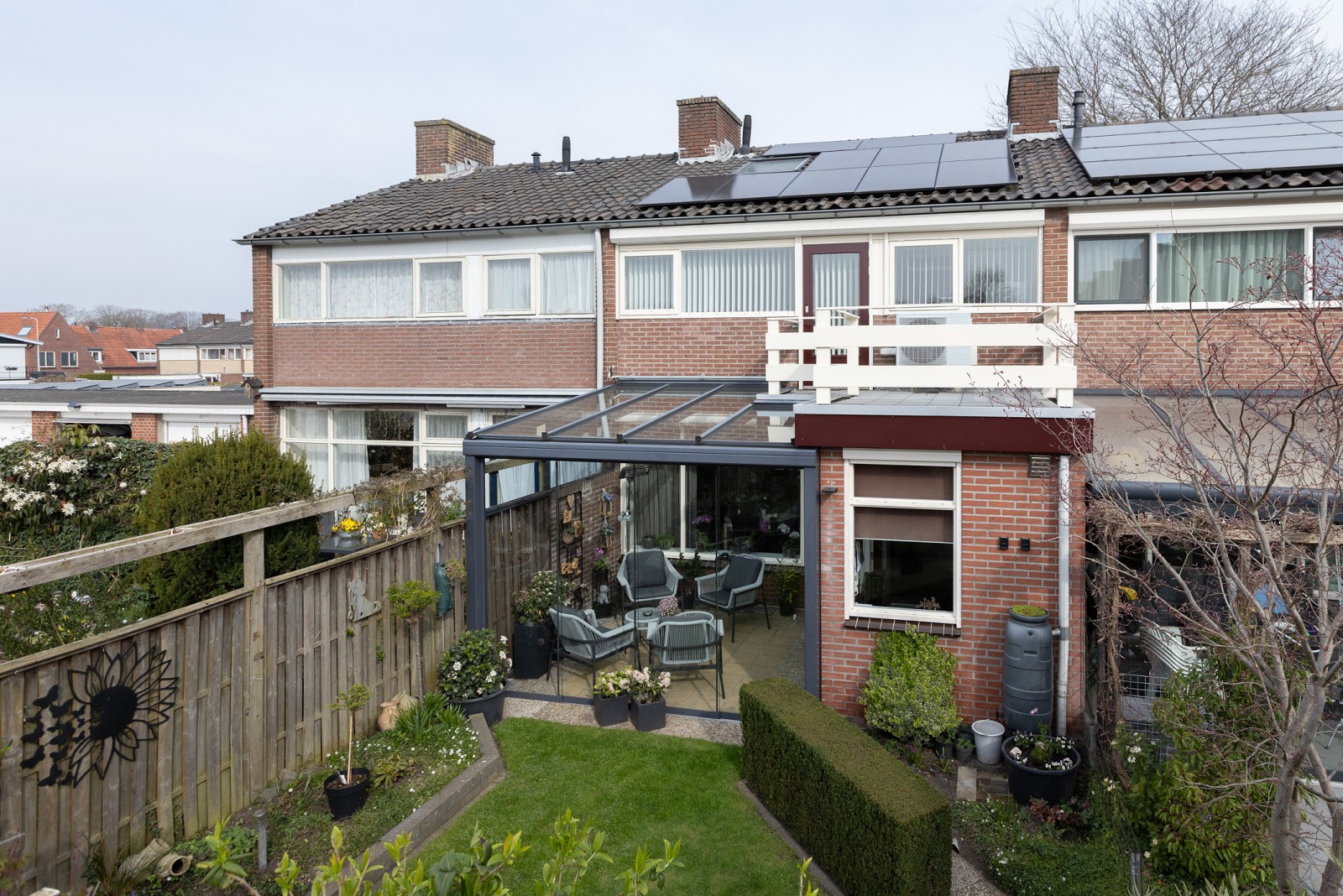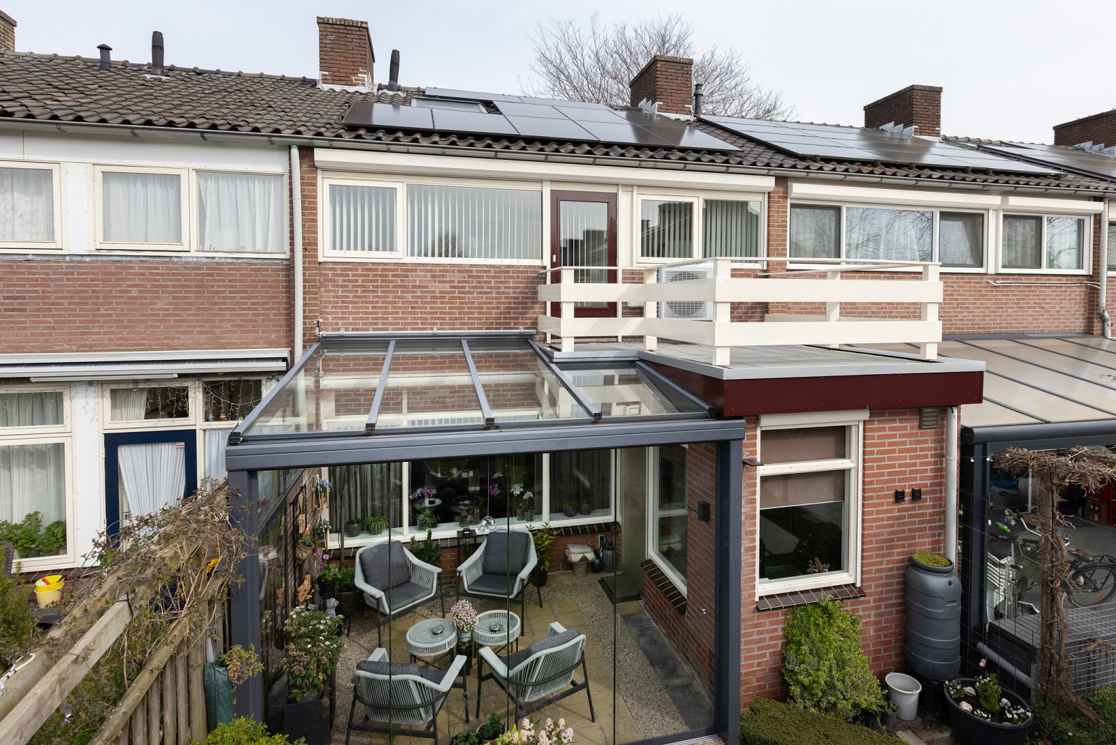 – De serre is geplaatst in 2018 en aan de binnenzijde voorzien van een knikarmscherm voor zonwering.