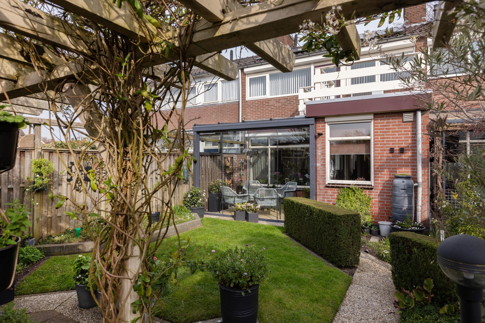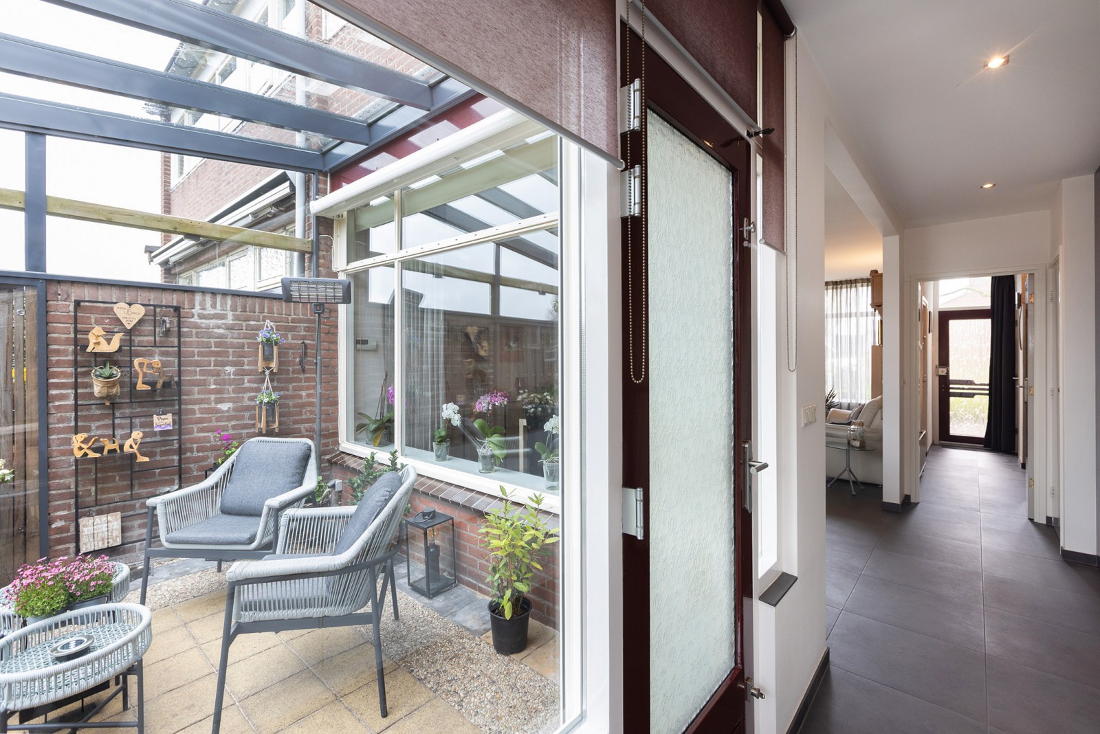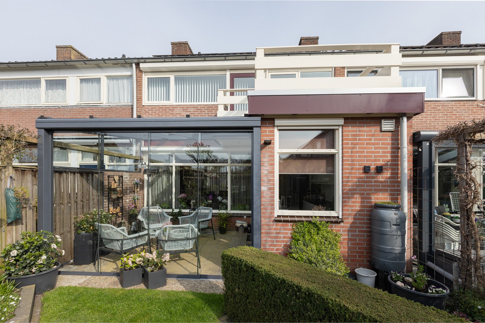 – De serre is geplaatst in 2018 en aan de binnenzijde voorzien van een knikarmscherm voor zonwering.