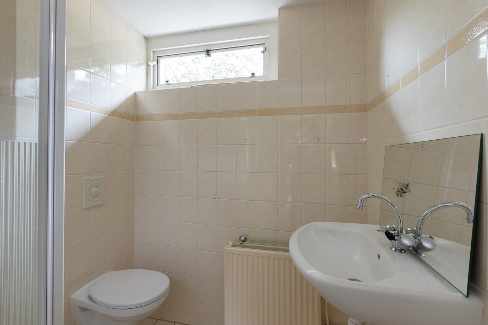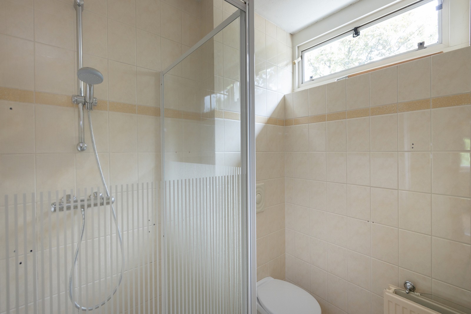 Overloop met toegang tot drie slaapkamers, waarvan twee met praktische vaste kasten. De badkamer is voorzien van een douche, wastafel en toilet.