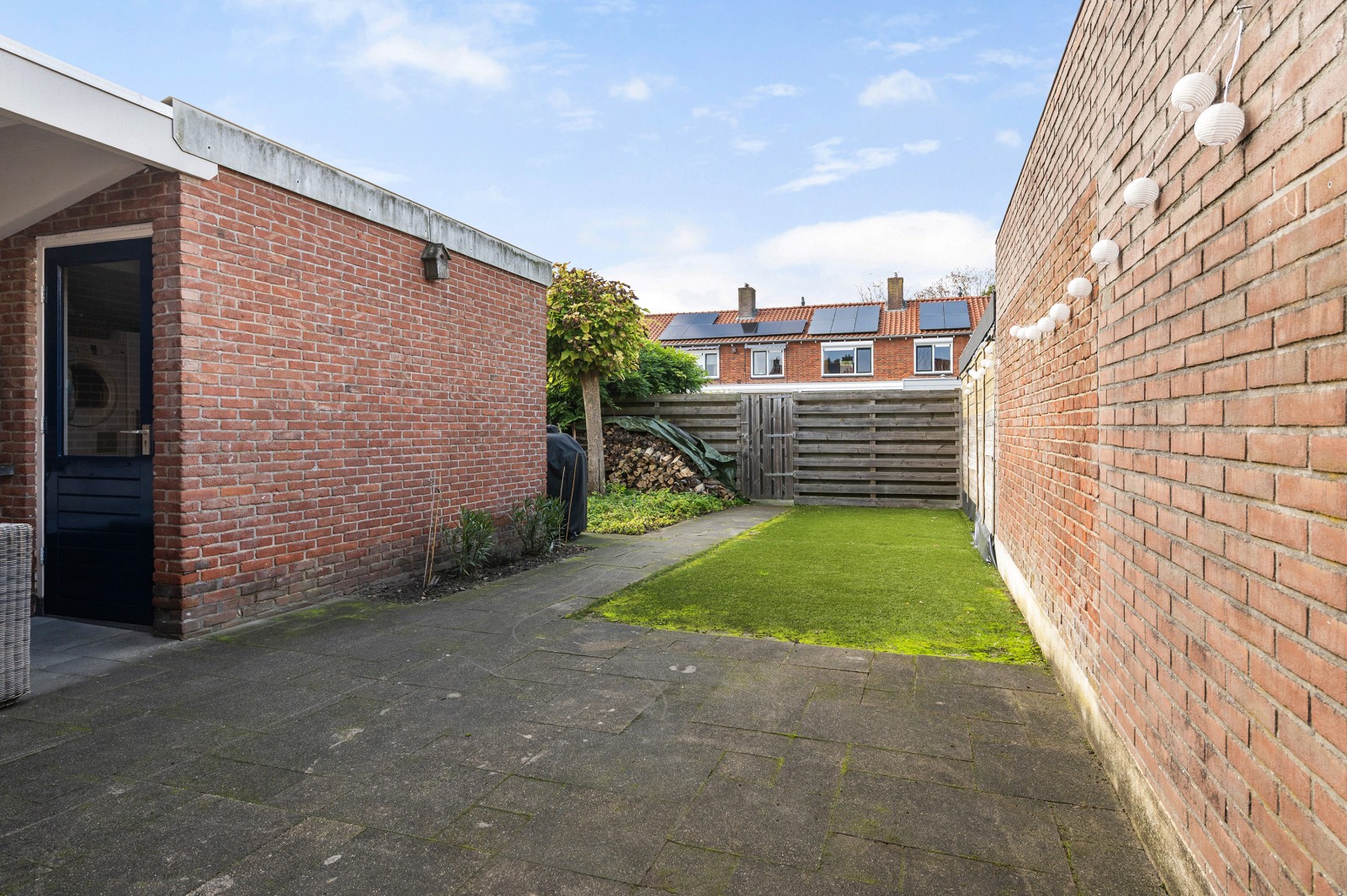 – Diepe achtertuin met veranda, kunstgras en borders.