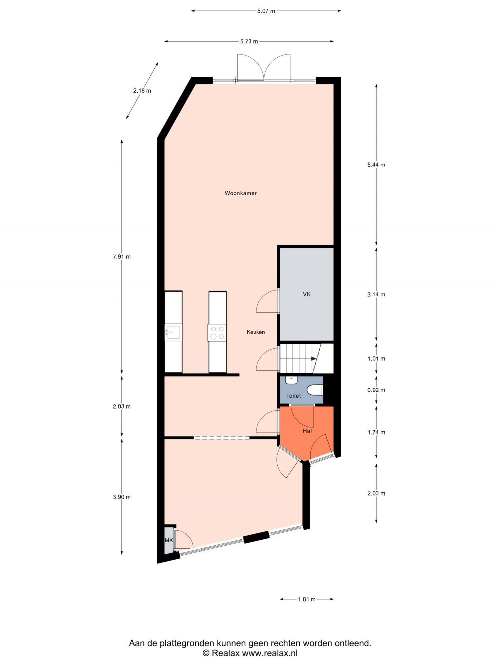 De hal/entree biedt toegang tot het toilet. Aan de voorzijde van het huis bevindt zich een kamer die perfect ingericht kan worden als eetkamer of extra woonkamer. Vanuit deze voorkamer is de ruimte voor de keuken te bereiken, die naar wens nog geplaatst dient te worden. De tuingerichte woonkamer is licht en ruim, met openslaande tuindeuren die toegang geven tot de buitenruimte. Daarnaast is er een royale vaste kast, ideaal voor extra opbergruimte.”