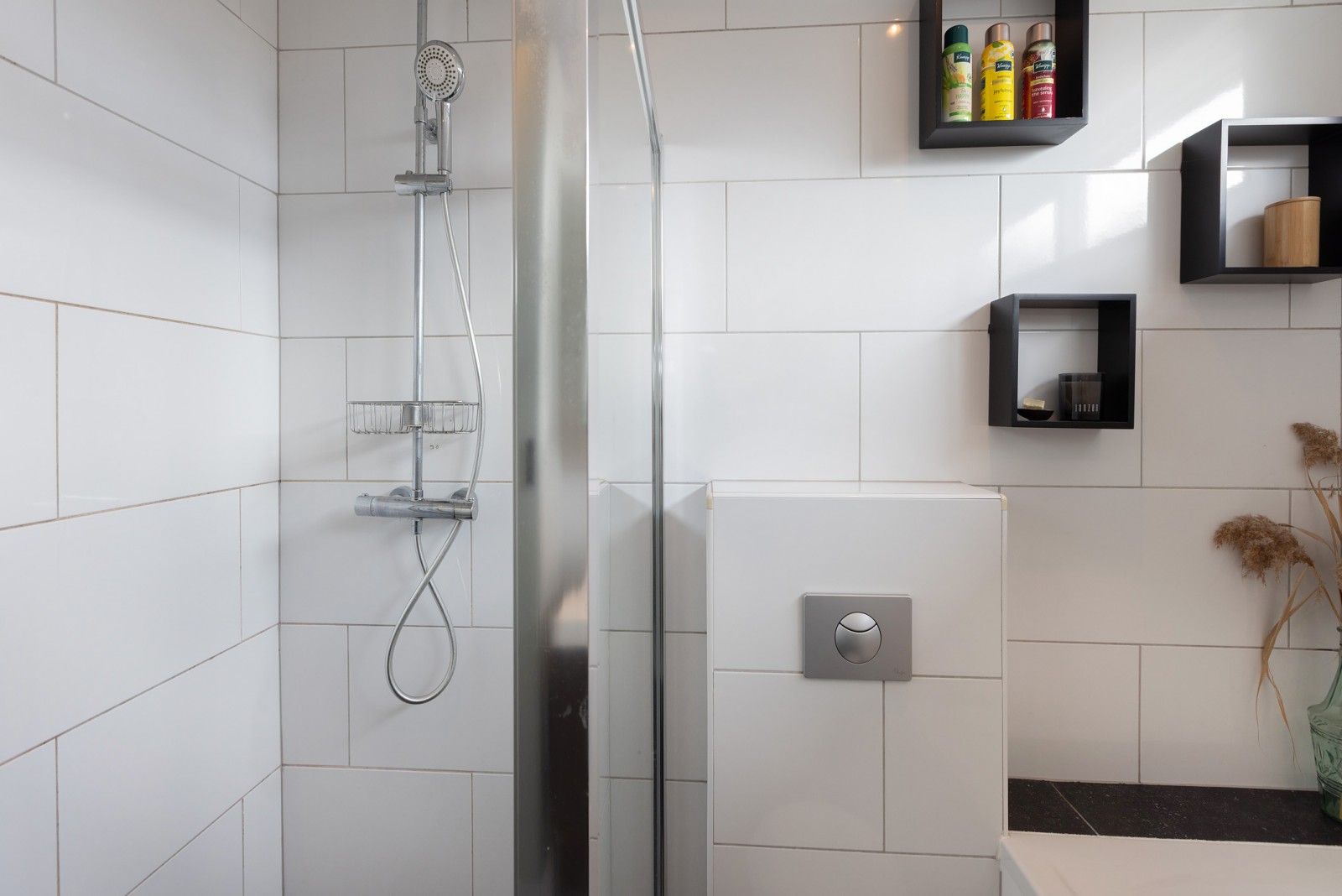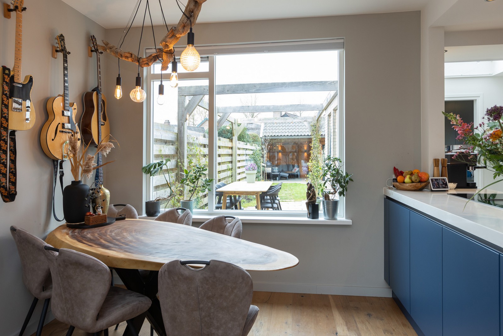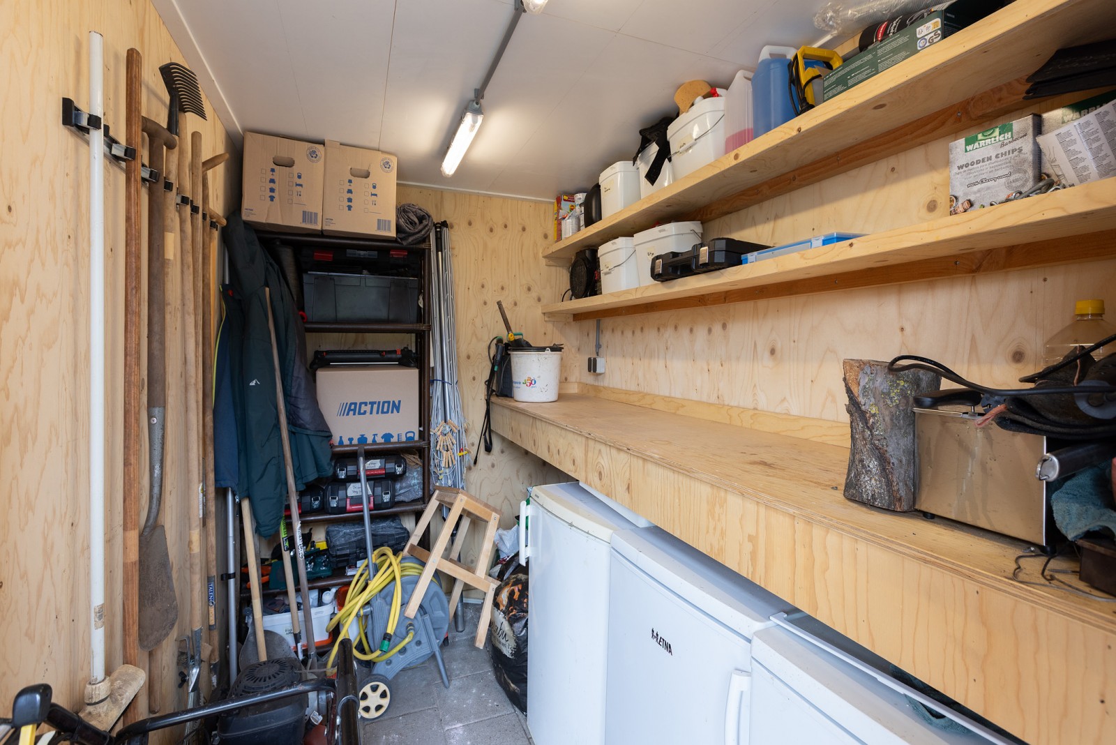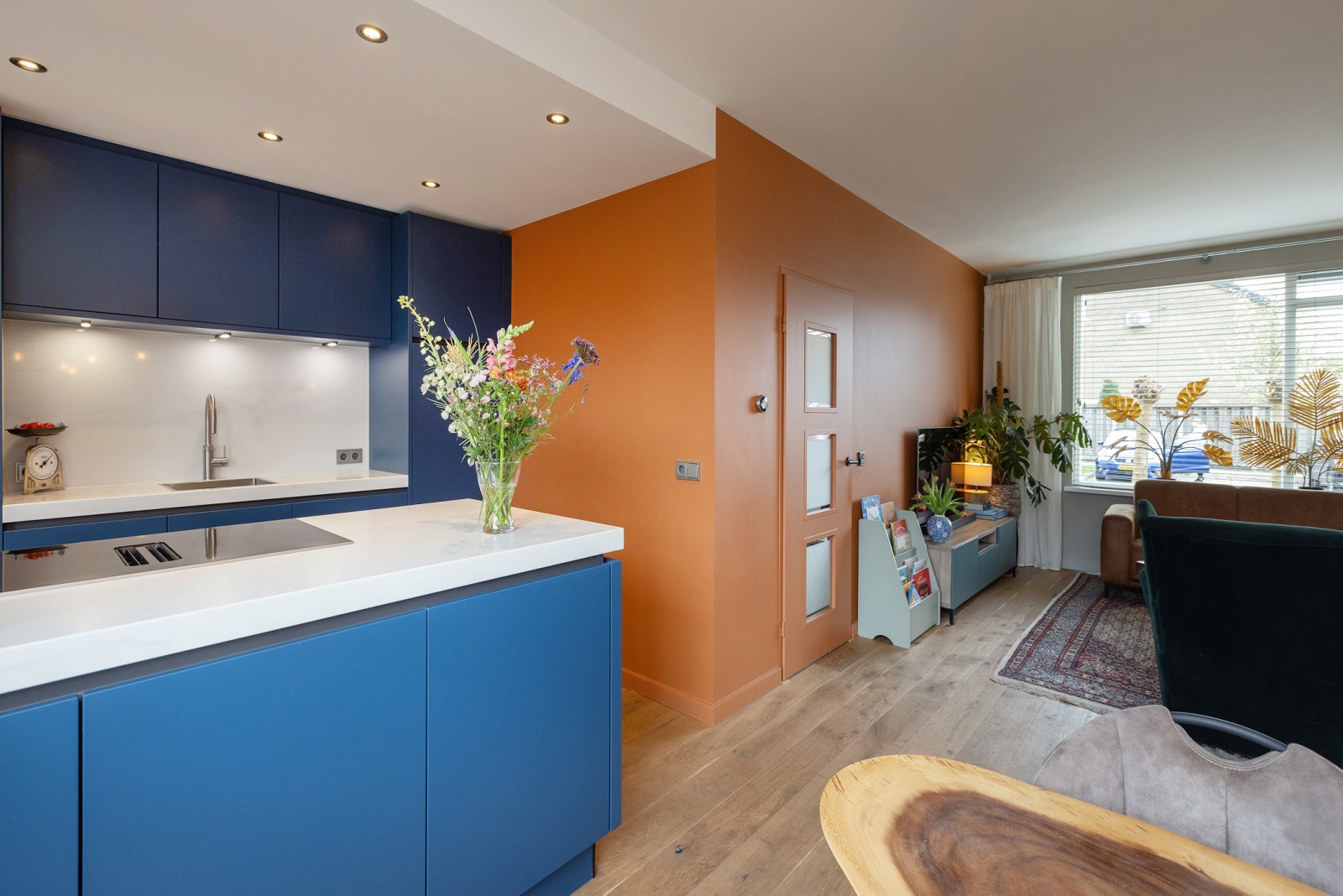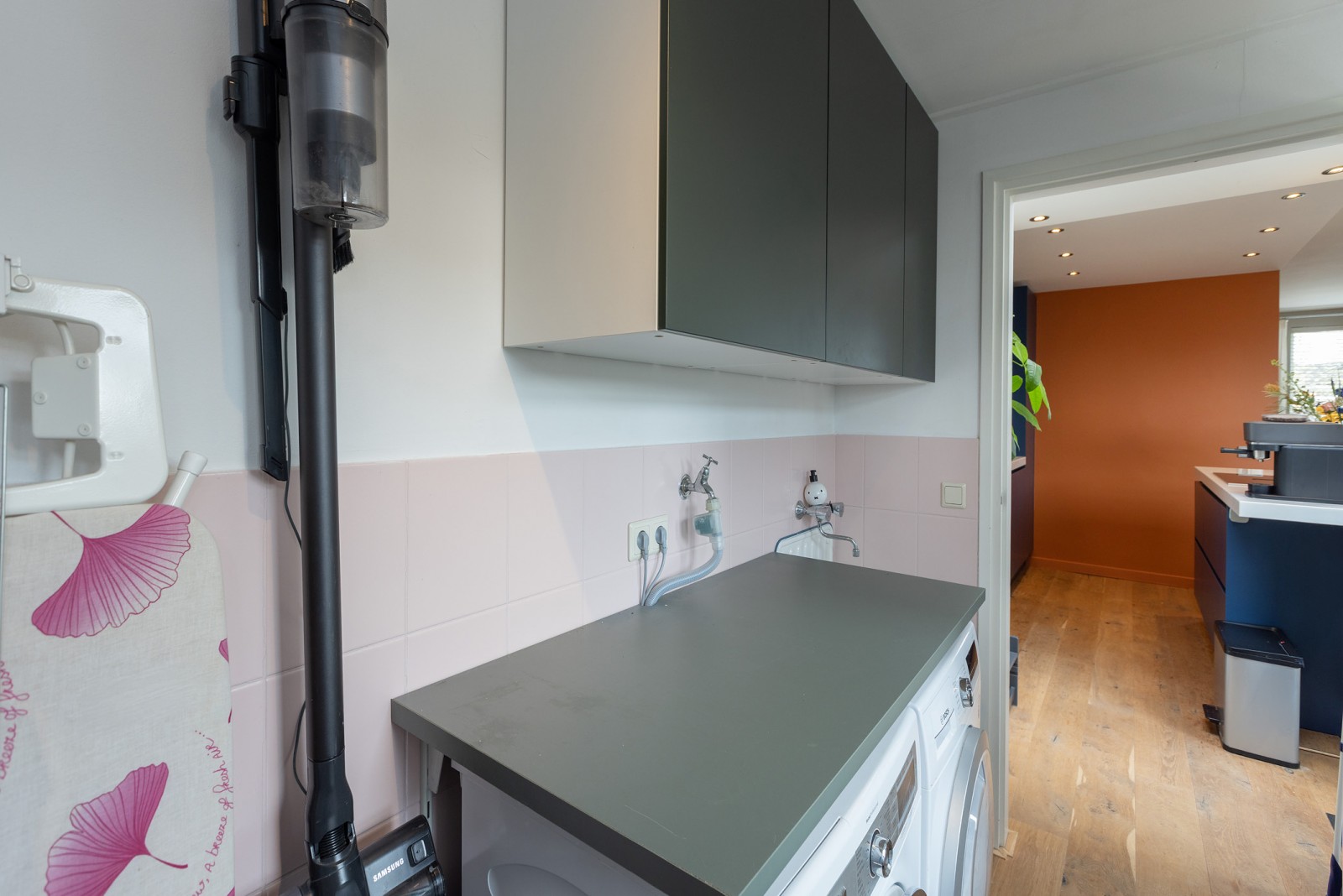 Hal/entree met toilet en fonteintje, trapopgang en handige trapkast. Ruime, tuingerichte woonkamer met veel sfeer en lichtinval. Eyecatcher in de woning is de in 2024 geplaatste, luxe inbouwkeuken. Deze is voorzien van een kookeiland en volledig uitgerust met vaatwasser, inductiekookplaat met geïntegreerde afzuigkap (recirculatie), oven, combi-oven, koelkast en Quooker. De keuken beschikt daarnaast over een composiet aanrechtblad met een natuursteen-look en diverse spotjes. De keuken biedt toegang tot de bijkeuken. Een praktische ruimte met veel opbergmogelijkheden en aansluitingen voor de wasmachine en de droger.