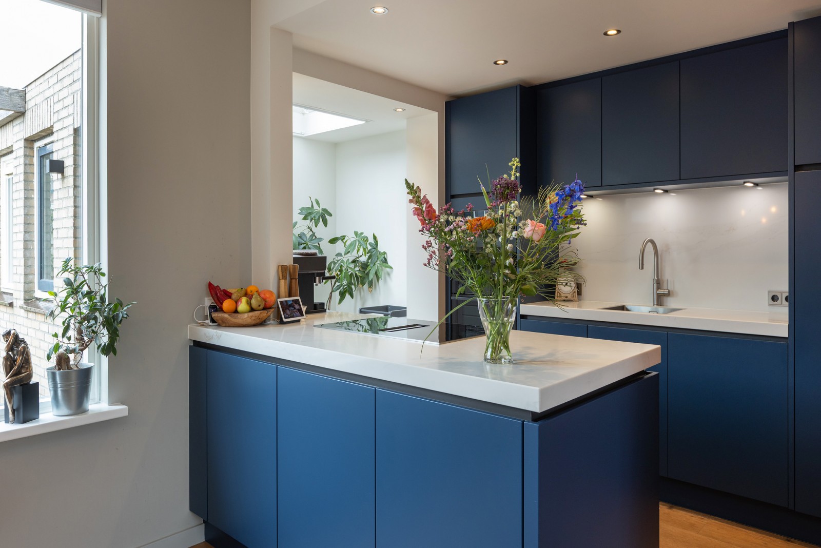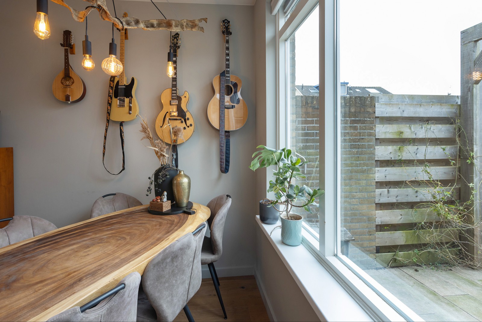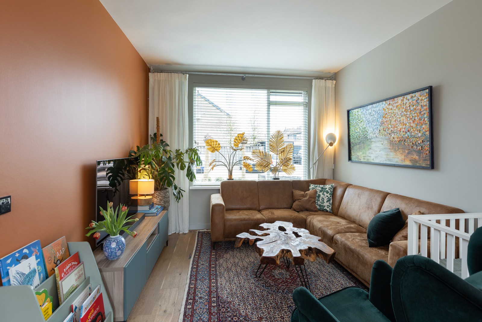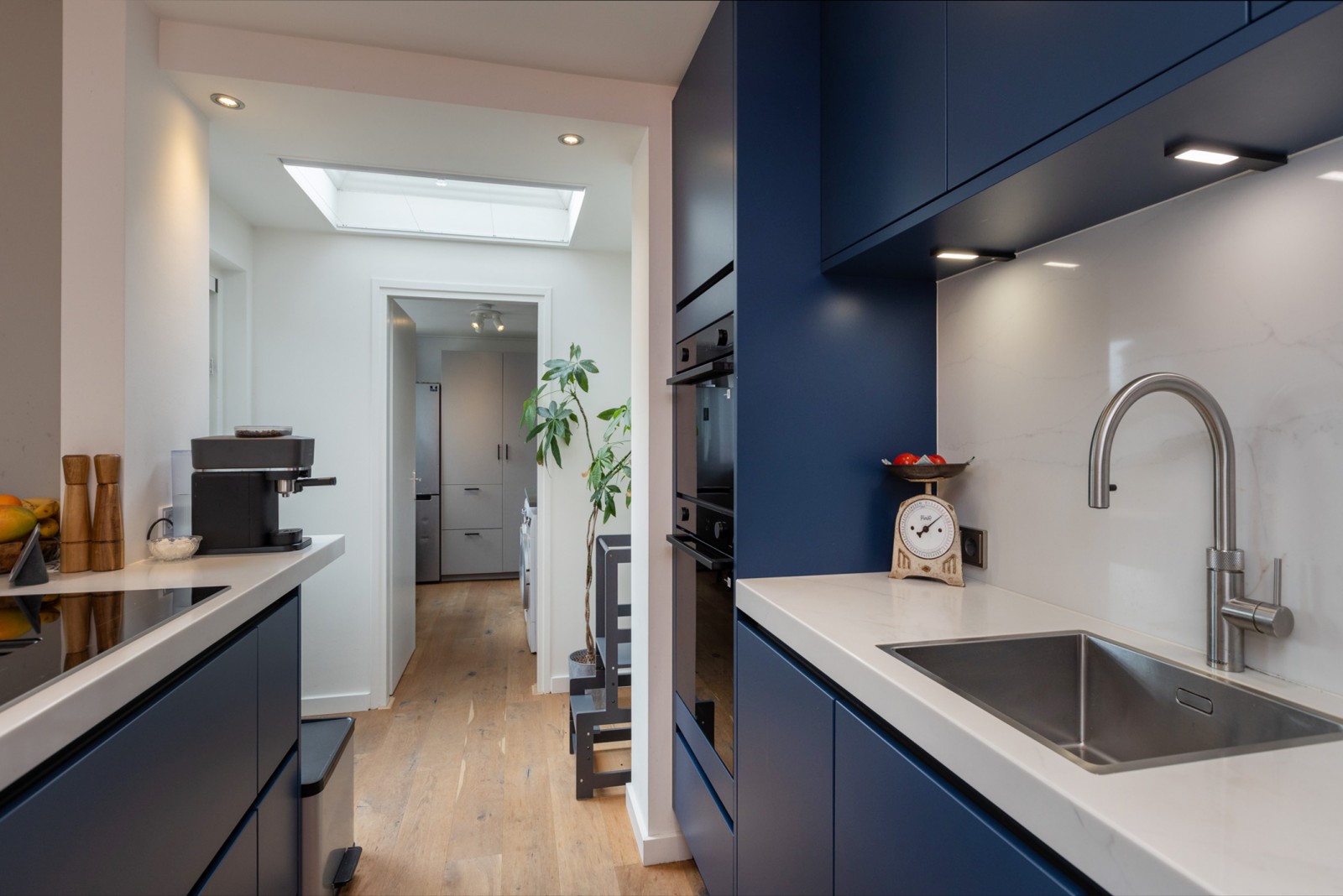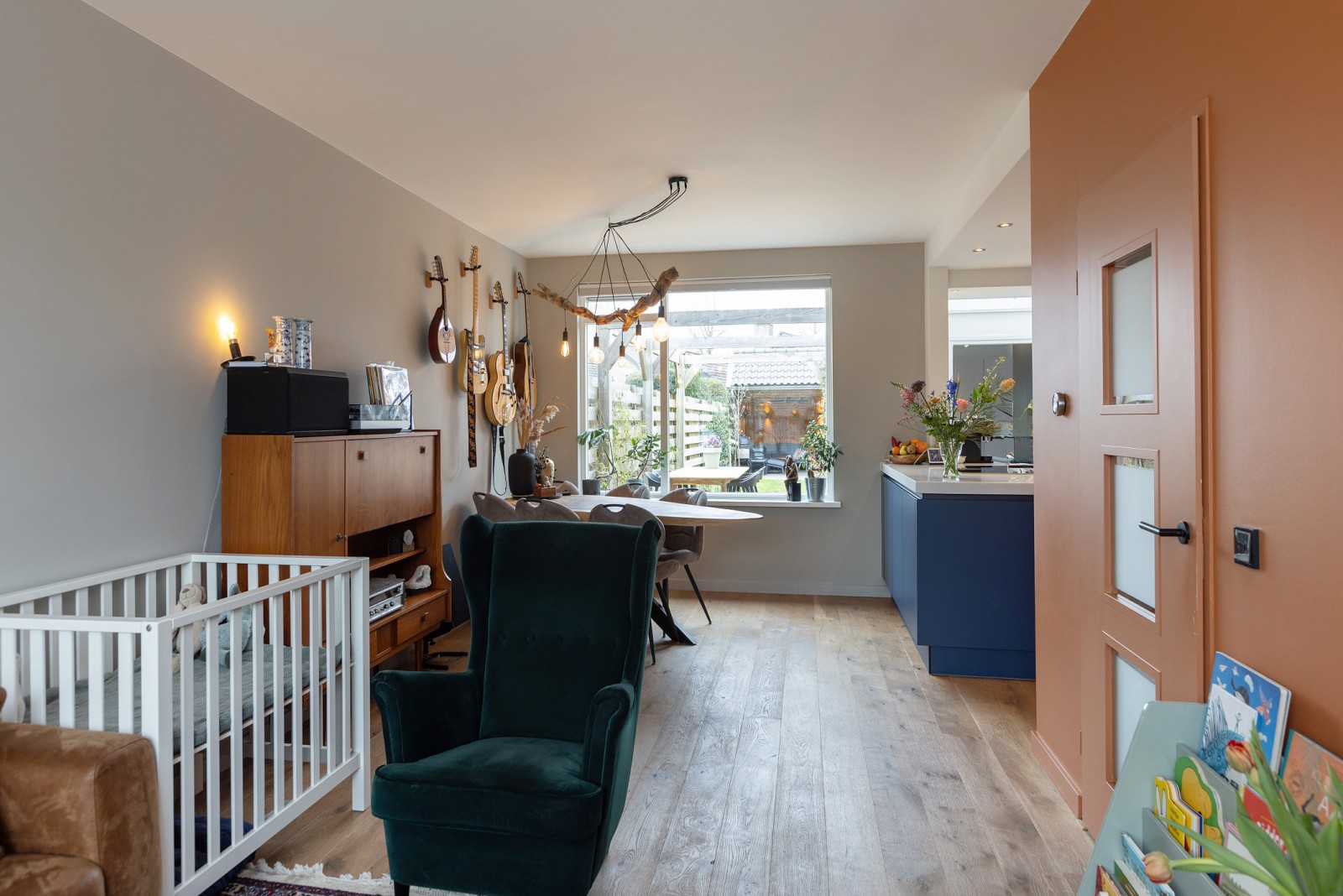 Hal/entree met toilet en fonteintje, trapopgang en handige trapkast. Ruime, tuingerichte woonkamer met veel sfeer en lichtinval. Eyecatcher in de woning is de in 2024 geplaatste, luxe inbouwkeuken. Deze is voorzien van een kookeiland en volledig uitgerust met vaatwasser, inductiekookplaat met geïntegreerde afzuigkap (recirculatie), oven, combi-oven, koelkast en Quooker. De keuken beschikt daarnaast over een composiet aanrechtblad met een natuursteen-look en diverse spotjes. De keuken biedt toegang tot de bijkeuken. Een praktische ruimte met veel opbergmogelijkheden en aansluitingen voor de wasmachine en de droger.