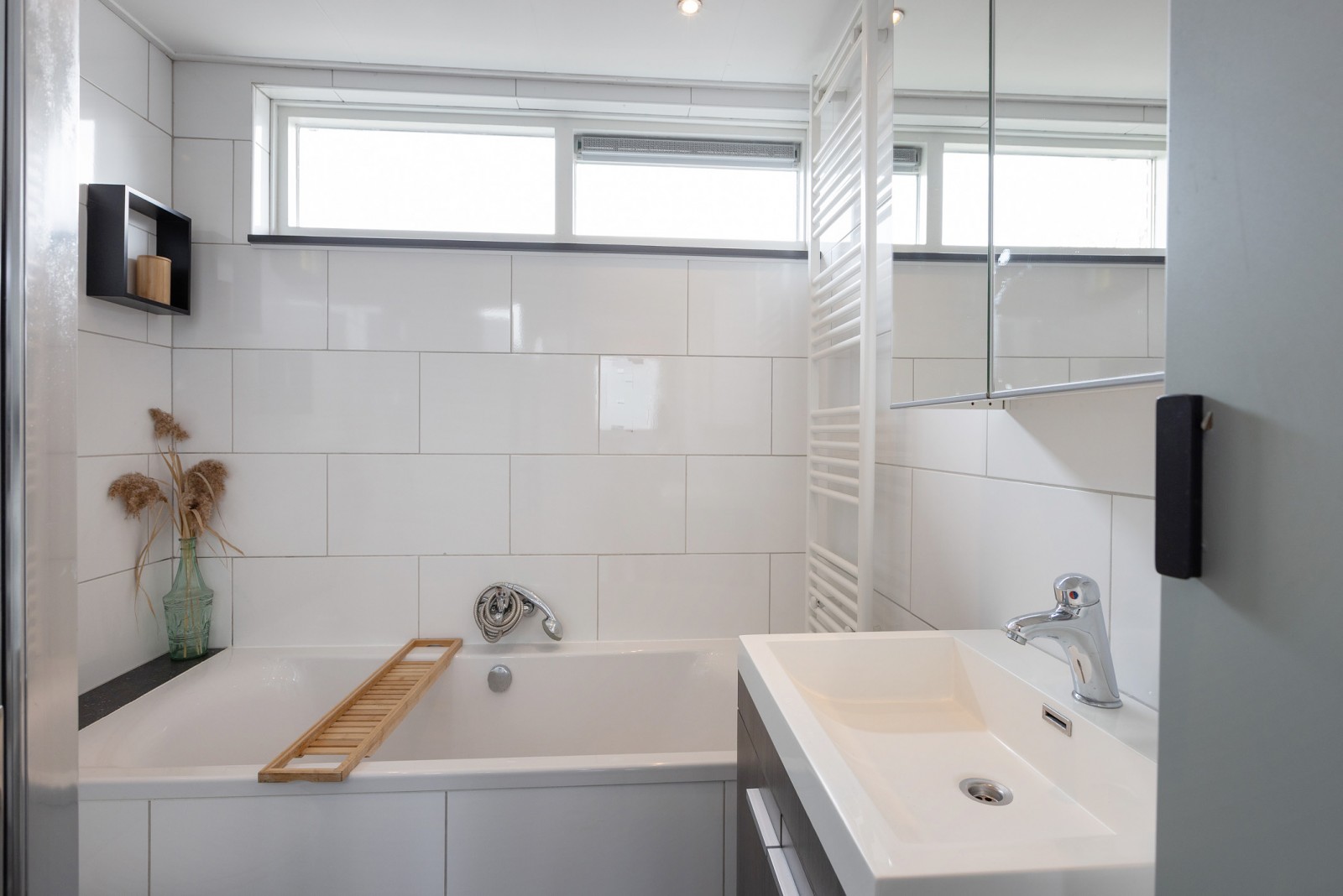 Overloop met toegang tot drie slaapkamers. Nette, volledig uitgeruste badkamer met ligbad, douche, toilet en een wastafel met meubel. Daarnaast is de eerste verdieping voorzien van een airco-installatie.