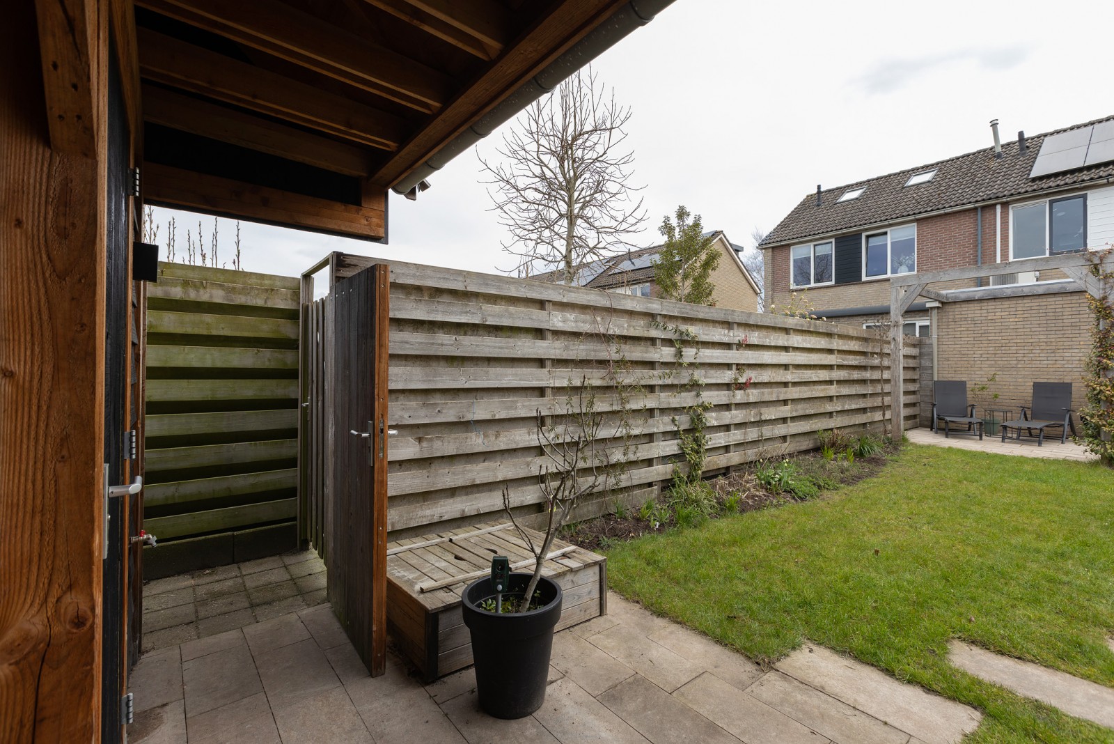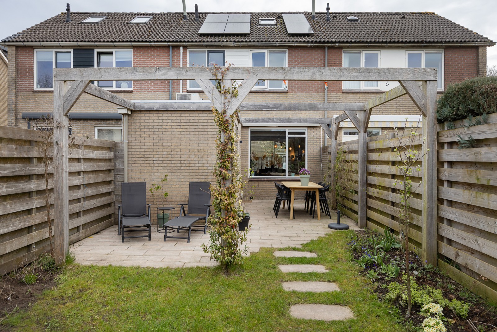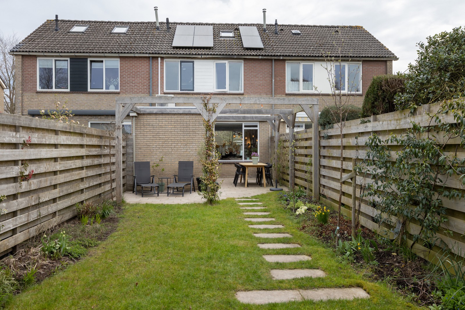 – De diepe achtertuin is mooi aangelegd met sierbestrating, een gazon, een pergola en borders. Voor de pergola is er een zonnedoek aanwezig dat op warme dagen zorgt voor de nodige schaduw. Daarnaast beschikt de tuin over een fraaie Douglas terrasoverkapping met schuur/berging (2021) voor het stallen van fietsen en is deze bereikbaar via een achterom. De overkapping is fraai afgetimmerd, voorzien van wandspots en stijlvolle vloertegels. Kortom, een heerlijke tuin om in de zomer te genieten van het buitenleven.
