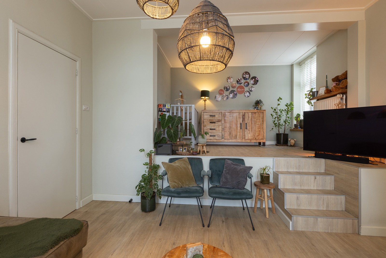 -> Gezellige woonkamer met houtkachel en verhoogd zitgedeelte, perfect voor een knusse sfeer,
